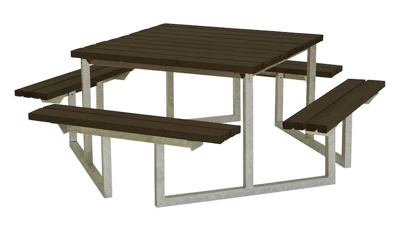 Piknikpöytä 8 henkilölle Erina, sertifioitu havupuu, musta. Tämä ryhmäpenkki edustaa modernia, suoraviivaista ja luonnollista kalustesuunnittelua. Pöytä ja istuinpenkit ovat liitetty yhdeksi kokonaisuudeksi, jossa on tilaa 8 henkilölle. Soveltuu erinomaisesti jatkuvaan ulkokäyttöön. Saatavilla selkänojan kanssa tai ilman selkänojaa. FSC®-sertifioitu havupuu ja kuumasinkitty teräsputkirunko takaavat tukevan rakenteen, josta on pitkään iloa päivittäisessäkin käytössä. Soveltuu erinomaisesti tauko- ja oleskeluympäristöihin yritysten ulkoalueilla, julkisissa ympäristöissä, puistoissa ja viheralueilla.
