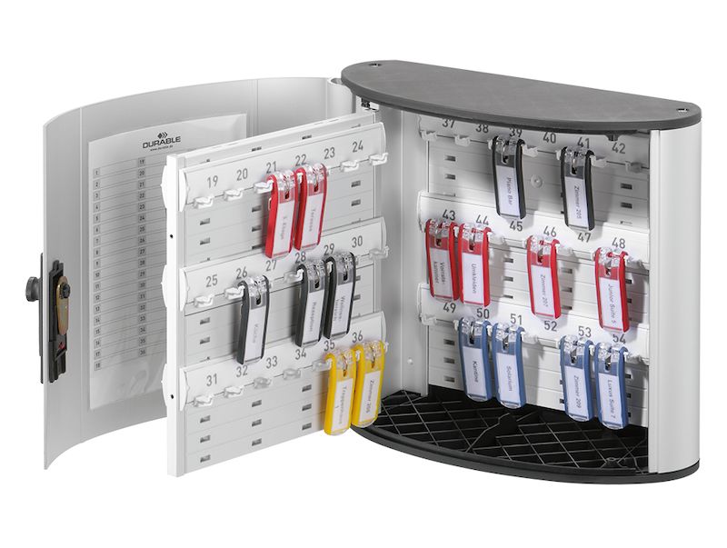 Kätevä avaimenperä roikkuu siististi avainkoukussa, helppo kiinnittää ja irrottaa. Avaimenperän kannellinen etiketti helpottaa nimeämistä. Avainkaapissa on sylinterilukko, ja toimitukseen sisältyy 6 kpl avaimenperiä ja etikettejä.