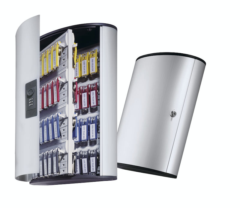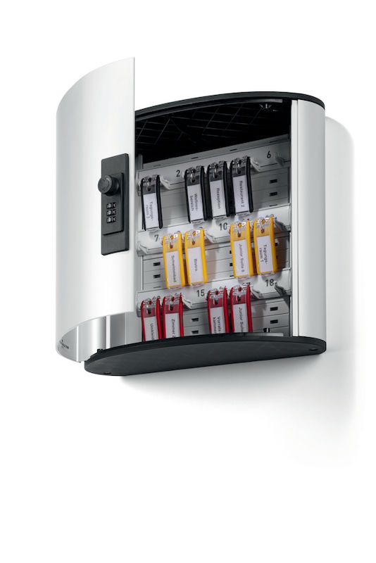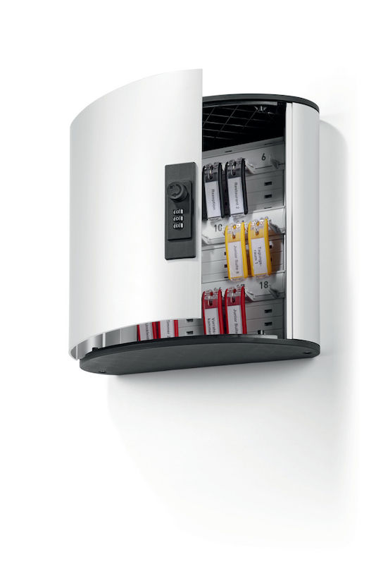 Avainkaappi Selina, koodilukko, KxLxS 280 x 300 x 118 mm, 18 koukkua. Numeroitu hakemistolehti ja numerot säädettävissä avainlistoissa.