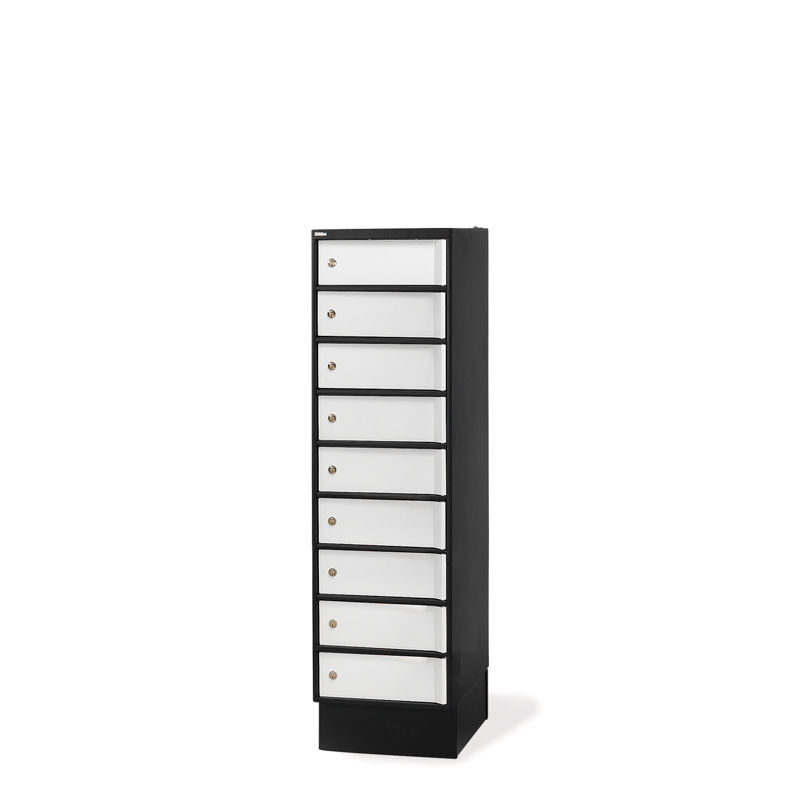 Latauskaappi Sono, pistorasialla, K 1473 mm, musta/valkoinen, 1 x 9 lokeroa, L 400 mm. Kannettavien tietokoneiden, matkapuhelinten ym. säilytykseen ja lataukseen. Jokaisessa lokerossa on pistorasia. Luukut ovat rakenteeltaan vahvoja ja niissä on Assa-sylinterilukko 8450, pääavainjärjestelmä. Luukuissa on turvallisuutta parantava takareunalukitus.