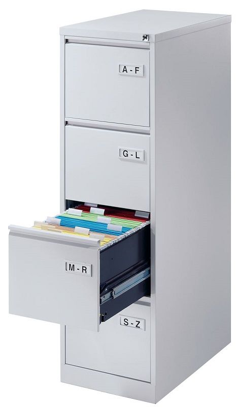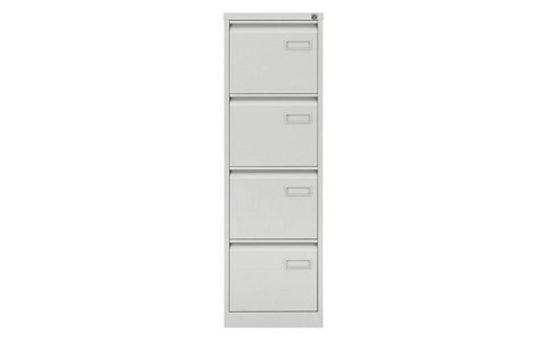 Riippukansiokaappi Bisley Ekonomi, perusmalli 4 laatikolla, vaaleanharmaa. Yksinkertainen malli, koolle A4, vaaka. Hitsattu teräsrunko, paksuus 0,70 mm. Täysin ulosvedettävät, suljetut laatikot, ulosvetoeste. Keskuslukitus, jossa yksittäinen lukitus, toimituksen sisältyy 2 avainta. Karkea jauhemaalaus. Kuormitus korkeintaan 40 kg / laatikko.
