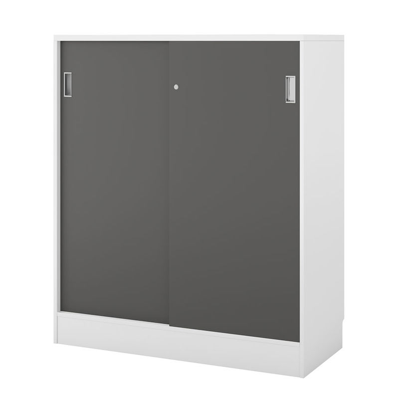 Toimistokaappi Chicago, LxSxK 1215x400x1353 mm, valkoinen/tummanharmaa. Lukittavat liukuovet. Runko on valmistettu koivu-, tammi- tai valkoisesta laminaatista. Ovet koivu-, tammi-, valkoisesta tai harmaasta laminaatista. Toimitetaan koottuina. Laminaatti: Päällilevyssä on koivu- tai tammipäällyste, harmaa tai valkoinen päällyste ja reunalista ABS-muovia. Pöydän pinta on kova ja erittäin naarmun- ja iskunkestävä. Väri on kestävä, eli se ei muutu vanhetessaan. Sisämitta: leveys 2 x 580 mm, syvyys 320 mm.