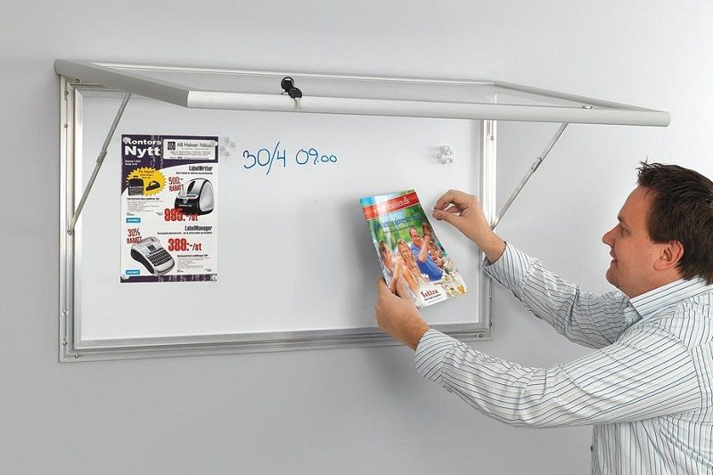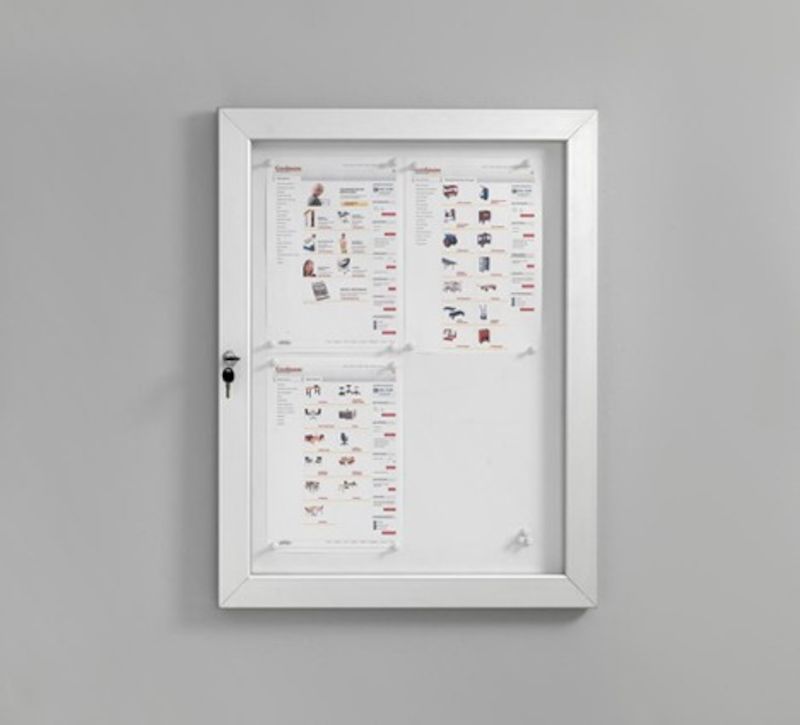 Lukittava ilmoitustaulukaappi, jota voidaan käyttää myös valkotauluna. Runko ja ovi alumiinia. Tausta valkoseksi maalattua teräspeltiä, johon ilmoitukset on helppo kiinnittää magneeteilla. Toimitukseen sisältyy 10 magneettia. Voidaan asentaa pysty- tai vaaka-asentoon. Sisä- ja ulkokäyttöön.