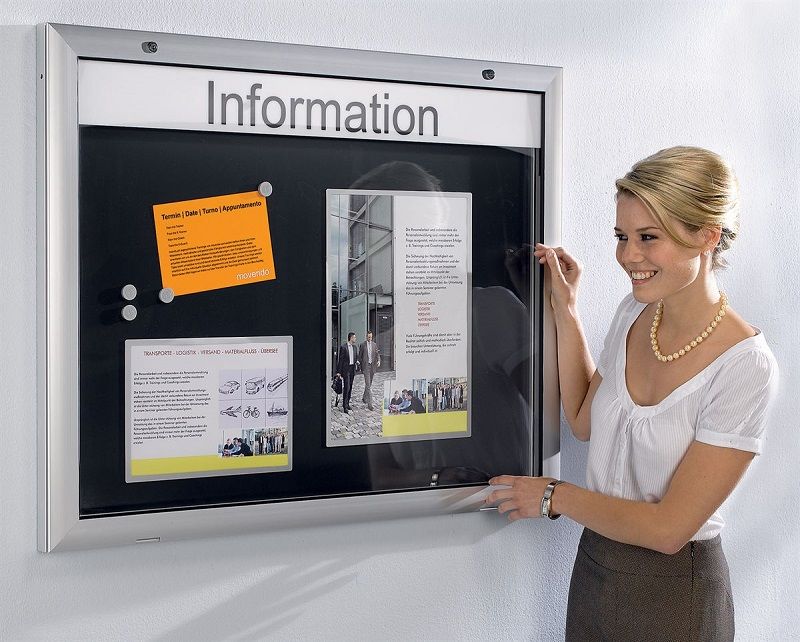 Ilmoitustaulukaappi sisä- ja ulkokäyttöön, oviaukko 180° alas, koolle A3, takaseinä antrasiitinharmaa (RAL 7016). Sisä- ja ulkokäyttöön Syvyys 43 mm Säänkestävä alumiinirakenne Integroitu tuuletus- ja kuivatusjärjestelmä Oviaukko 180° alas Saatavana runsaasti lisävarusteita. Huoltovapaa harjattu hopeaeloksoitu alumiinirakenne, integroitu tuuletus- ja kuivatusjärjestelmä. Etulevy 4 mm karkaistua lasia. Patentoitu puoliksi upotettu saranajärjestelmä: levy ei jumiudu lukittaessa. Ovi avautuu 180° alaspäin, helpottaa kaapin sisällön vaihtamista. Sylinterilukot, yleisavain, 2 avainta/lukko. Hitsatut kumitiivisteet estävät ulosvetämisen kulmista ja antavat hyvän tiiviyden. Hyvä säänkesto. Sisätausta sinkittyä teräspeltiä, kehys harmaanvalkoinen (RAL 9002), suojamaalattu. Vakiomalliset ilmoituskaapit aina ilman tekstilistaa. Tekstilista saatavana lisävarusteena. Sis. 10 harmaata magneettia ja 1 A4-kokoisen magneettitaskun.