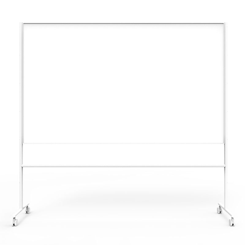 Tyylikäs valkotaulu tukevarunkoisella maalatulla jalustalla, jolle poikittaistuki antaa lisävakautta, ja kääntyvillä pyörillä, joista kaksi jarrullisia.