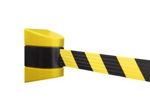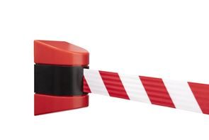 Rajausnauha, seinään kiinnitettävä Gilbert, magneettiasennus, punainen/valkoinen, ulosvedettävän nauhan pituus 3500 mm. Muovikotelo ja rajausnauha magneeteilla joustavaan rajaukseen varastossa, nostovaunukäytössä jne.
