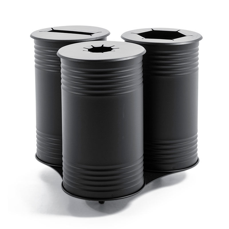 Jäteastia Tin, K 600 mm, pyörillä, kolmiosainen, kannella, musta. Laadukas roskis, jonka designin inspiraationa on ollut tyhjä palautustölkki, joka on yksi hyvin vahva jätesymboli.