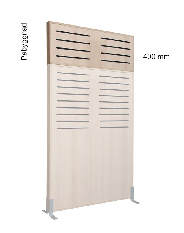 Suora lisäosa Silence-sermiin, 800x400 mm, puu/puu, koivu. Silence-lisäosa on Silence-sermiin kuuluva lisävaruste. Se asennetaan 1500 mm korkean Silence-sermin päälle, jolloin sermin kokonaiskorkeus on 1900 mm.