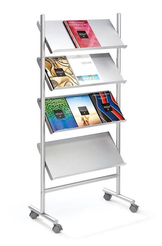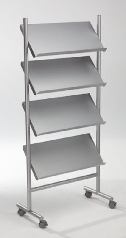 Teräksinen esiteteline KxLxS 1560 x720x 355 mm. Kehys ja taso hopeanväristä terästä. Tasot 45 asteen kulmassa. 40 mm reuna, tilaa usealle esitteelle. Lukittavat kääntöpyörät.