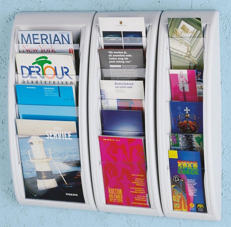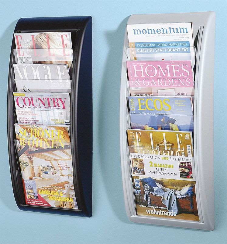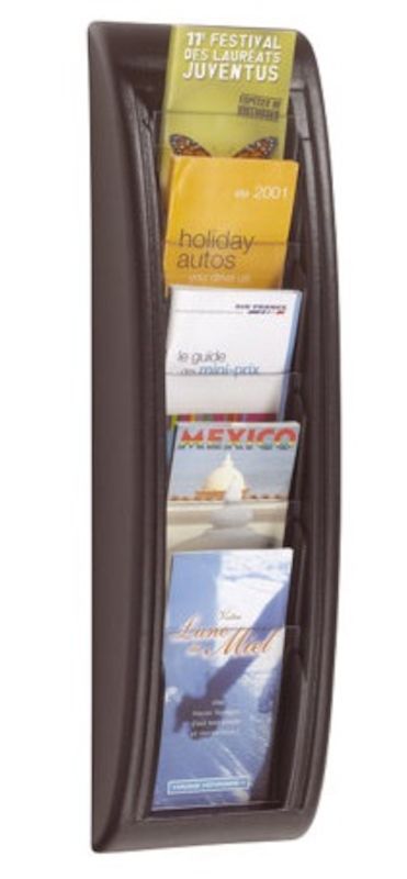 Esiteteline seinälle, 5 lokeroa koolle 1/3 A4, musta, 2 kpl/pakkaus. Runko iskunkestävää polystyreeniä. Voidaan kiinnittää seinään. Esitteet näkyvät erinomaisesti kirkkaan pinnan läpi. Täyttösyvyys 18 mm. 2 tuotetta/pakkaus.