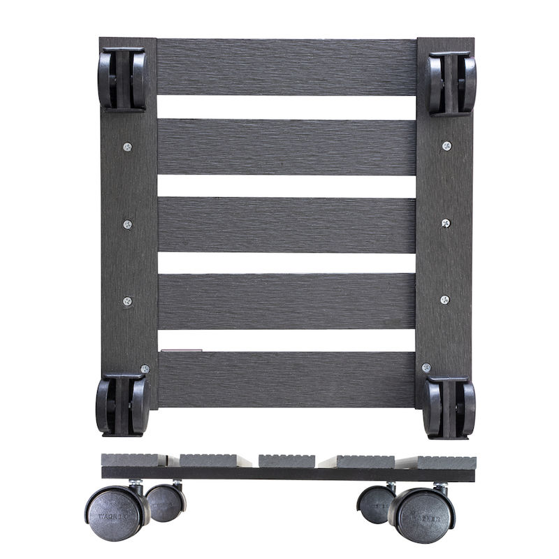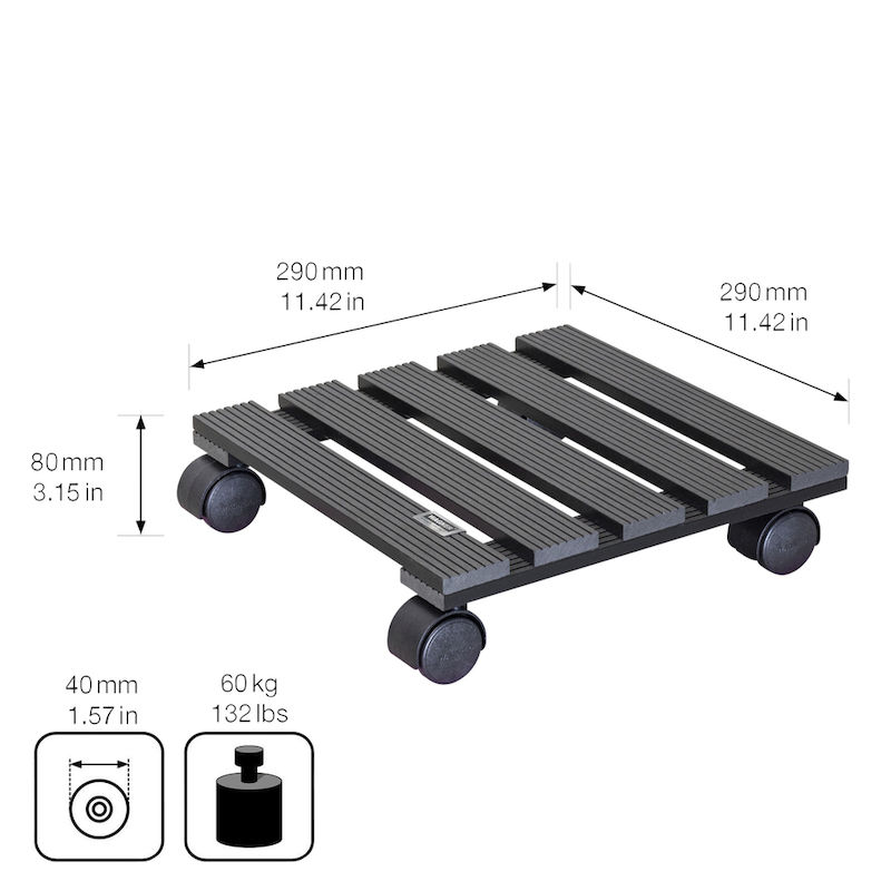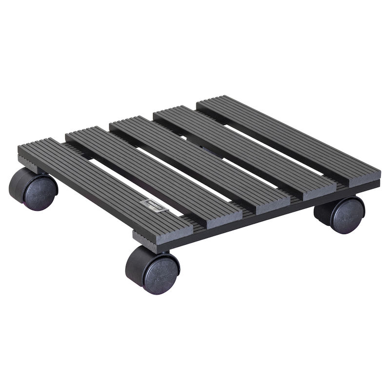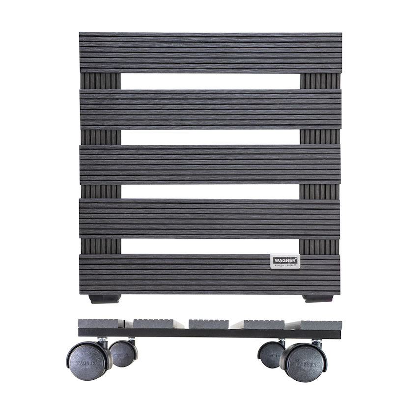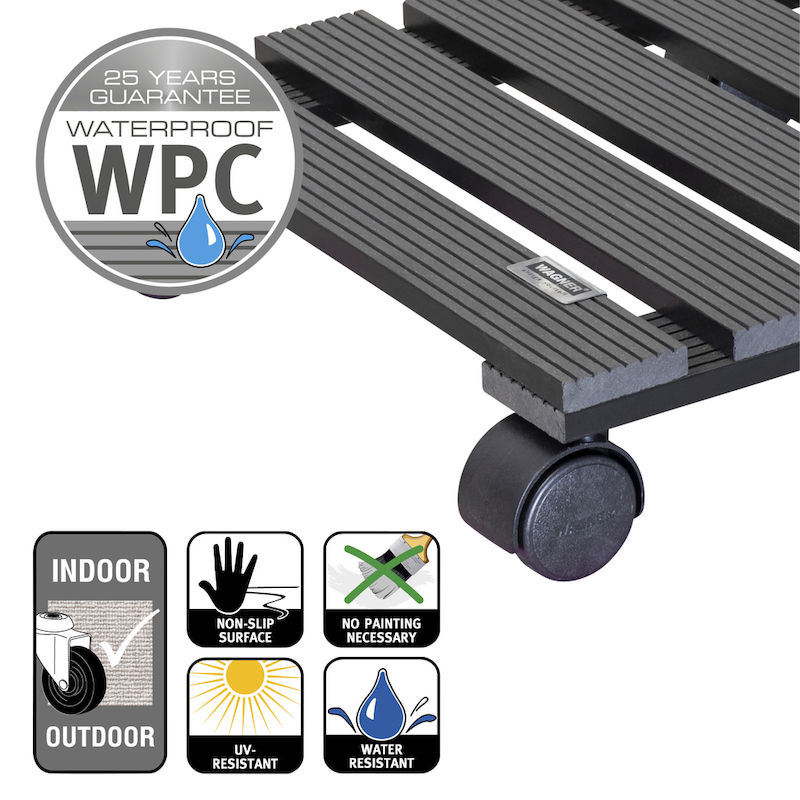 Ruukun alusta pyörillä WPC Wagner, kantavuus 60 kg, PxL 290 x 290 mm, antrasiitinharmaa, 2 kpl/pakkaus. Tämän innovatiivisen ruukunalustan kuormataso on valmistettu WPC-komposiitista. WPC (Wood-Plastic-Composite) on moderni materiaali, joka näyttää luonnolliselta puulta. WAGNER käyttää vain vastuullisesti kasvatettua puuta. Ruukunalustalle on myönnetty kansainvälisesti tunnettu ja tunnustettu ympäristömerkki.
