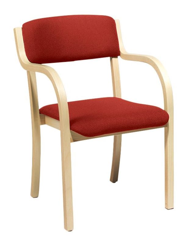 Neuvottelutuoli Chelsea, koivu, punainen. Pinottava kokoustuoli, joka on valmistettu muotoon puristetusta pyökistä tai koivusta. Saatavilla käsinojilla tai ilman, monta eri värivaihtoehtoa. Hyvin pehmustetut selkänoja ja istuin. Tehdasasennetut liitoshelat lisävarusteena.