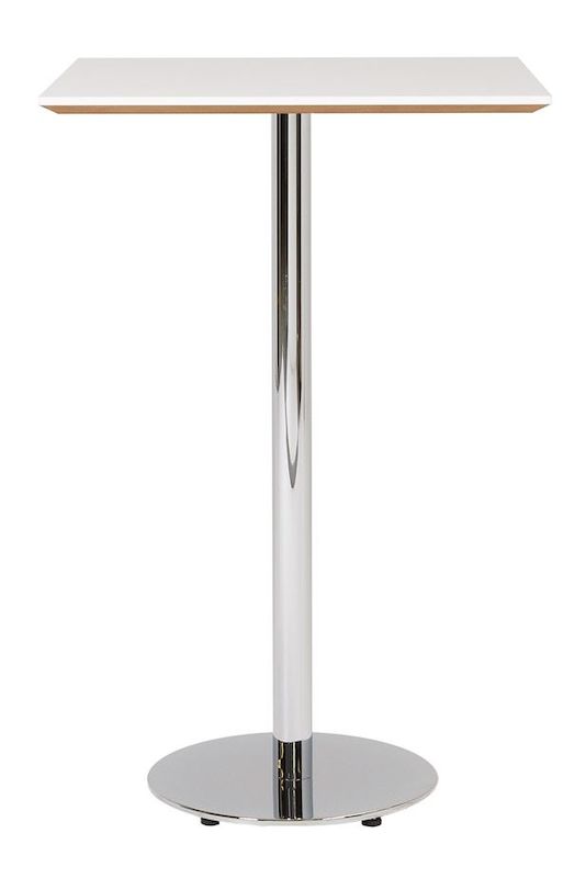 Baaripöytä Trend, LxSxK 700x700x1125 mm, kromattu pyöreä jalka. Baaripöytä Trend on seisomapöytä valkoisella, laminoidulla MDF pöytätasolla. Pöytätason 30 asteeseen viistetty reuna antaa siron vaikutelman. Jalustan väriksi voi valita kromin, mustan tai valkoisen, pyöreänä tai neliön muotoisena. Pöydän korkeus on 1125 mm.
