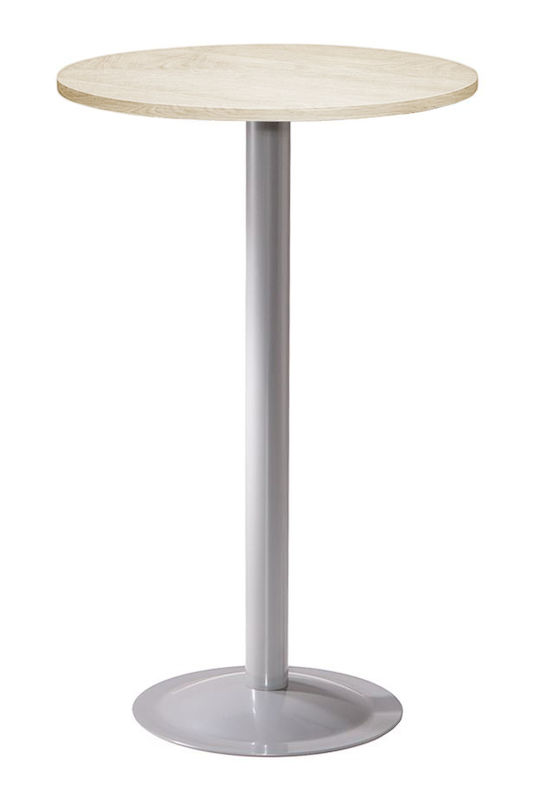 Seisomapöytä Sputnik, korkeus 1100 mm, 700 mm halkaisija, tammi/hopea. Hopeaksi maalattu teräsjalusta ja pöytälevy tammilaminaattia.