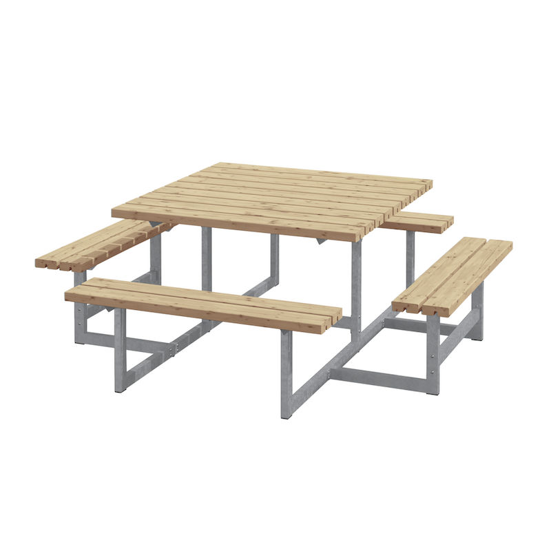 Piknikpöytä Ela, PxS 2000 x 2000 mm, ThermoWood, ruskea. Tämä piknikpöytä edustaa modernia, suoraviivaista ja luonnollista kalustesuunnittelua. Pöytä ja istuinpenkit ovat liitetty yhdeksi kokonaisuudeksi, jossa on tilaa 8 henkilölle. Soveltuu erinomaisesti jatkuvaan ulkokäyttöön. Saatavilla selkänojan kanssa tai ilman selkänojaa. FSC®-sertifioitu havupuu ja kuumasinkitty teräsputkirunko takaavat tukevan rakenteen, josta on pitkään iloa päivittäisessäkin käytössä. Soveltuu erinomaisesti tauko- ja oleskeluympäristöihin yritysten ulkoalueilla, julkisissa ympäristöissä, puistoissa ja viheralueilla.