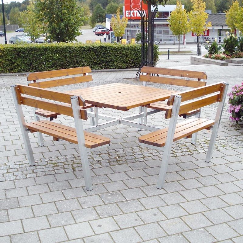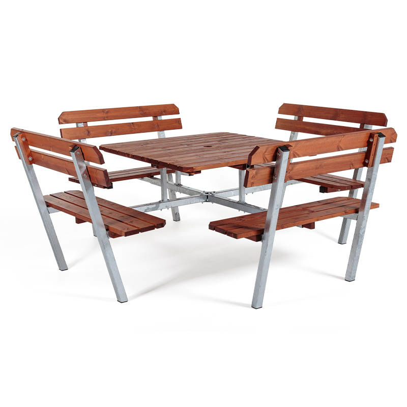 Piknikpöytä Quattro Steel on ulkotiloihin tarkoitettu istuinryhmä kiinteillä penkeillä ja sinkityllä rungolla. Ruskeaksi kuultolakattua umpimäntyä. Pöydän mitat: 1100x1100 mm. Kokonaismitta: 2200x2200 mm. Toimitus osina.