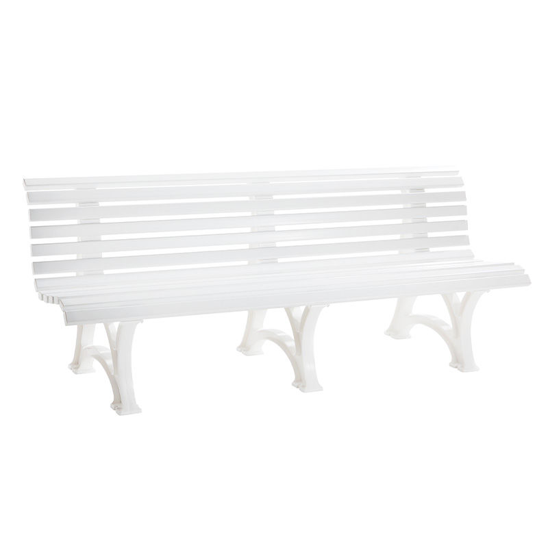 Puistonpenkki 13:lla PVC-rimalla, KxL 800x2000 mm, valkoinen. Valmistettu UV ja säänkestävästä muovista, helppohoitoinen. Istuimen ja selkänojan rimat PVC:tä, 50x30 mm. Jalusta polypropyleeniä. Valmius pulttaukseen. Toimitus osina, helppo koota.