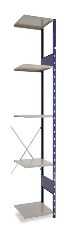 Varastohylly Gerdmanshylly, puolikas jatko-osa, LxSxK 500x500x3000, avoin, sininen/harmaa. Väri: sininen hyllytikas ja harmaat hyllytasot.
