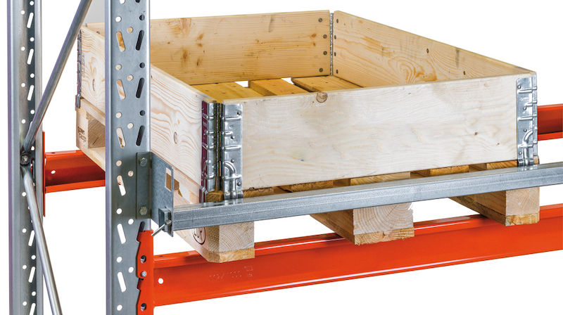 Takarajoitin kuormalavahyllyyn Space, vaakapalkille 3600 mm. Lisävaruste. Takarajotin estää lavan työntämisen liian kauas. Saatavilla eri leveyksiä.