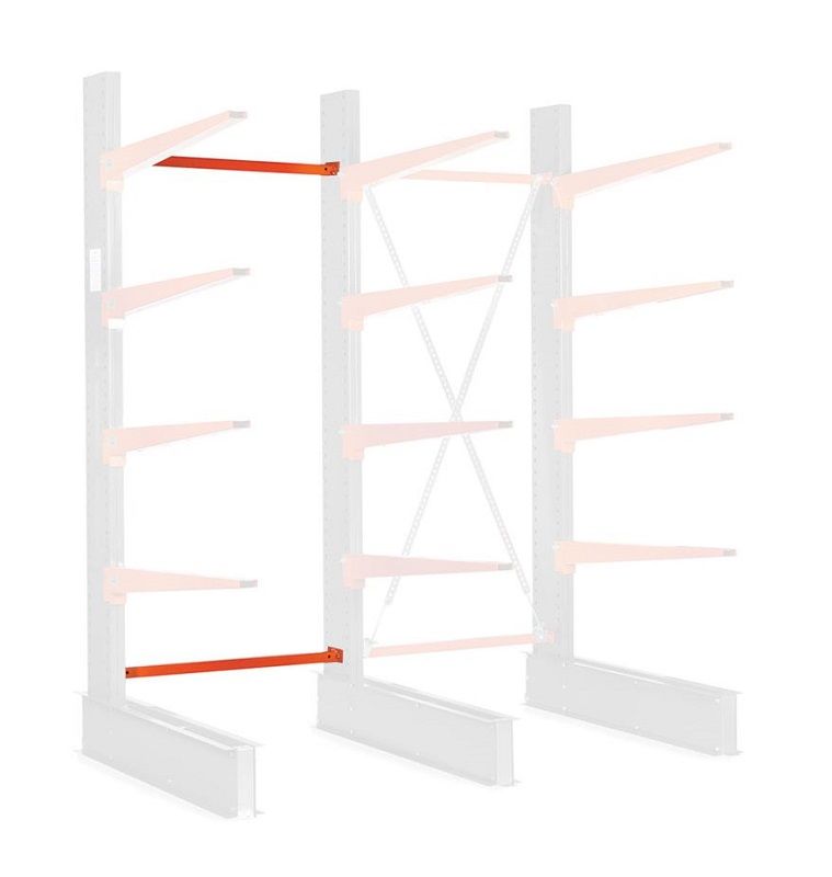 Takatuki ulokehyllyyn, painavalle tavaralle, ilman ristikkoa, L 1250 mm, K 3500 mm. Takatuki on saatavilla tukiristikolla tai ilman. Jokaiseen aloitettavaan perusosaan tarvitaan takatuki, jossa on tukiristikko ja jatko-osaan riittää takatuki ilman takaristikkoa. Jos jatkat hyllyjä pitkälle pätkälle, sijoita joka toiseen hyllyosioon takatuki, jossa on tukiristikko.