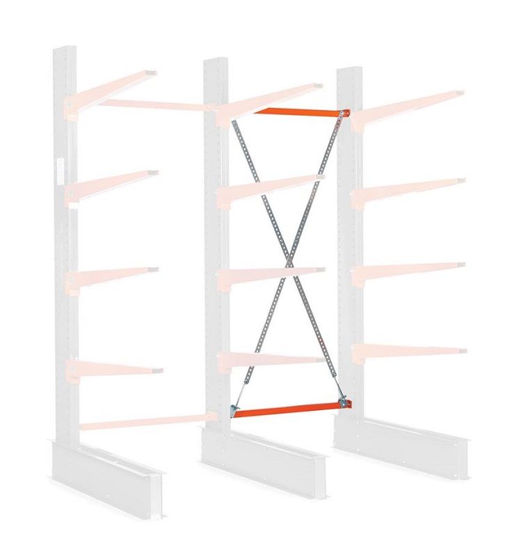 Takatuki ulokehyllyyn, painavalle tavaralle, ristikolla, L 2000 mm, K 3500 mm. Takatuki on saatavilla tukiristikolla tai ilman. Jokaiseen aloitettavaan perusosaan tarvitaan takatuki, jossa on tukiristikko ja jatko-osaan riittää takatuki ilman takaristikkoa. Jos jatkat hyllyjä pitkälle pätkälle, sijoita joka toiseen hyllyosioon takatuki, jossa on tukiristikko.