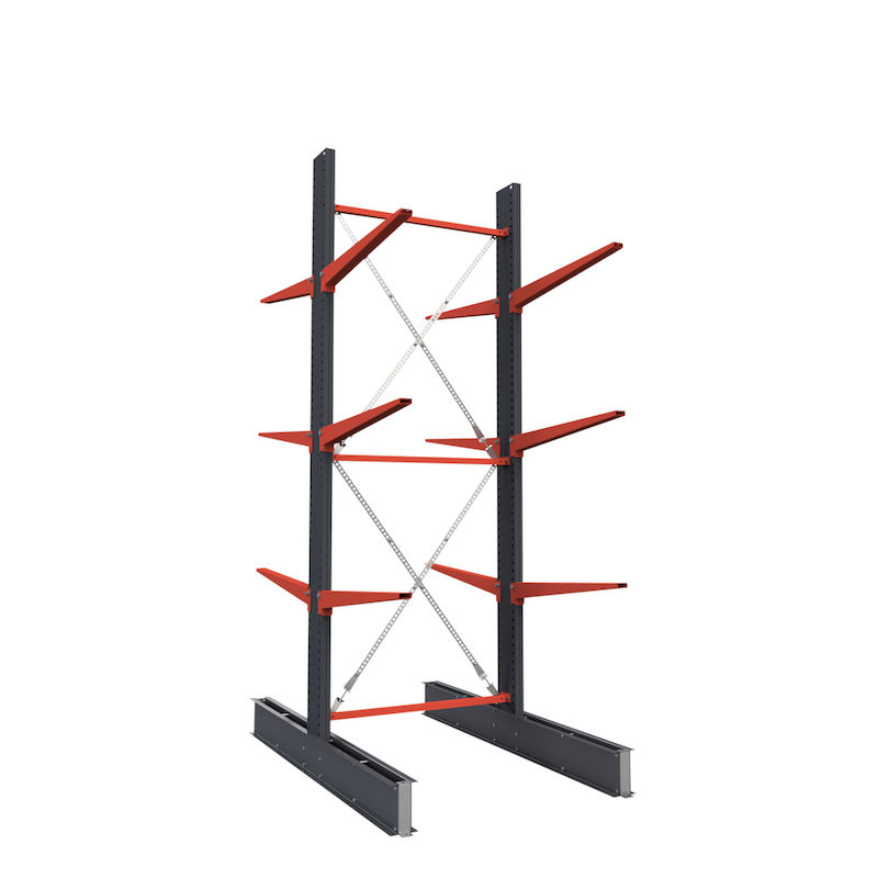 Ulokehylly Attillo, kaksipuolinen, KxL 3500 x 1000 mm, varsi 1000 mm, perusosa. Ulokehylly, mukana telineet, jalat, varret, pitkittäis- ja ristituet sekä betoniruuvit lattia-asennukseen.