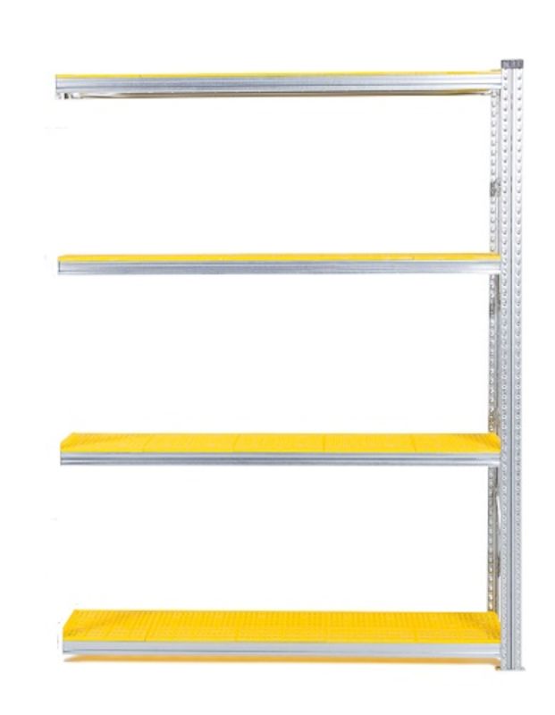 Teräshylly Flex, K 1972 mm jatko-osa, LxS 1506x320 mm, 4 kpl keltaista hyllytasoa. Joustava hyllyjärjestelmä sinkittyä terästä, useita käyttömahdollisuuksia monenlaisiin työympäristöihin. Alhainen omapaino - suuri kuormitus, 135-350 kg/hyllytaso. Siirrettävät palkit, hyllyt mahdollista asentaa 33 mm välein. Hyllytasoja eri työympäristöihin. Helppo koota (ei pultteja tai muttereita). Voidaan käyttää molemmilta puolilta, ei tarvita ristikkoa. Päädyt toimitetaan koottuna, kantopalkit ja metallijalat sisältyvät jokaiseen yksikköön. Muoviset hyllytasot ovat rei’itetty, joten ne toimivat myös ympäristöissä, joissa on sprinklerijärjestelmä jolloin vesi valuu hyllytasojen läpi. Kaikki muoviset hyllytasot ovat elintarvikehyväksyttyjä.
