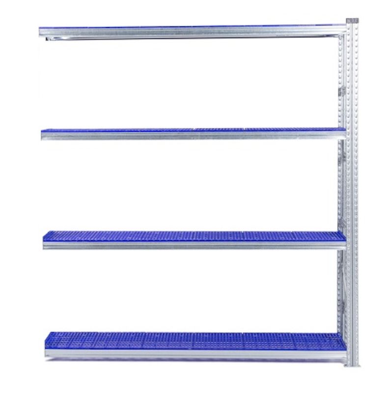 Teräshylly Flex, K 1972 mm jatko-osa, LxS 1806x320 mm, 4 kpl sinistä hyllytasoa. Joustava hyllyjärjestelmä sinkittyä terästä, useita käyttömahdollisuuksia monenlaisiin työympäristöihin. Alhainen omapaino - suuri kuormitus, 135-350 kg/hyllytaso. Siirrettävät palkit, hyllyt mahdollista asentaa 33 mm välein. Hyllytasoja eri työympäristöihin. Helppo koota (ei pultteja tai muttereita). Voidaan käyttää molemmilta puolilta, ei tarvita ristikkoa. Päädyt toimitetaan koottuna, kantopalkit ja metallijalat sisältyvät jokaiseen yksikköön. Muoviset hyllytasot ovat rei’itetty, joten ne toimivat myös ympäristöissä, joissa on sprinklerijärjestelmä jolloin vesi valuu hyllytasojen läpi. Kaikki muoviset hyllytasot ovat elintarvikehyväksyttyjä.