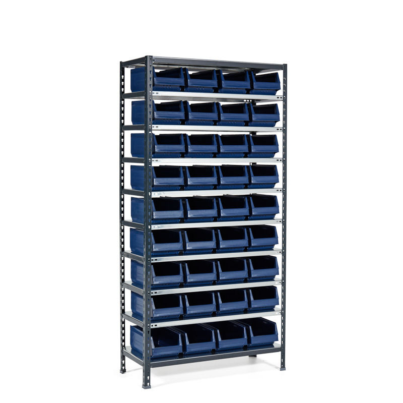 Varastohylly Falster, harmaa, ottolaatikoilla Anton, sininen 36 kpl, LxSxK 1000x400x2000 mm. Vankka teräshylly galvanoiduilla hyllytasoilla. Helppo asentaa täysin ilman ruuveja ja työkaluja. Sopii yhtä hyvin arkistohyllyksi kuin varastohyllyksi.
