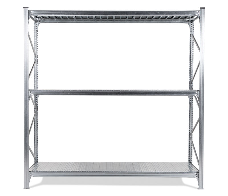 Varastohylly Maxi, perusosa, LxSxK 2486x800x2500 mm, galvanoidut hyllytasot. Varastohylly Maxi on joustava hyllyjärjestelm, joka on valmistettu galvanoidusta teräksesti. Hylly sopii hyvin tilaa vieville tavaroille. Alhainen omapaino - suuri kuormitus 450-500 kg/hyllytaso. 4 eri syvyyttä, 600 – 1200 mm. Siirrettävät palkit, jotka voi asettaa 33 mm:n välein. Hyllytasot ovat valmistettu galvanoidusta teräksestä. Helppo koota (ei pultteja tai muttereita). Voidaan käyttää molemmilta puolilta, ei tarvita ristikkoa. Päädyt toimitetaan koottuna, kantopalkit ja metallijalat sisältyvät jokaiseen yksikköön. Korkeus 2000 / 2500 mm.