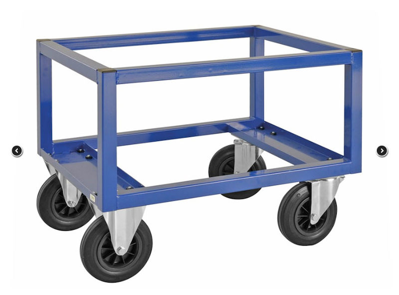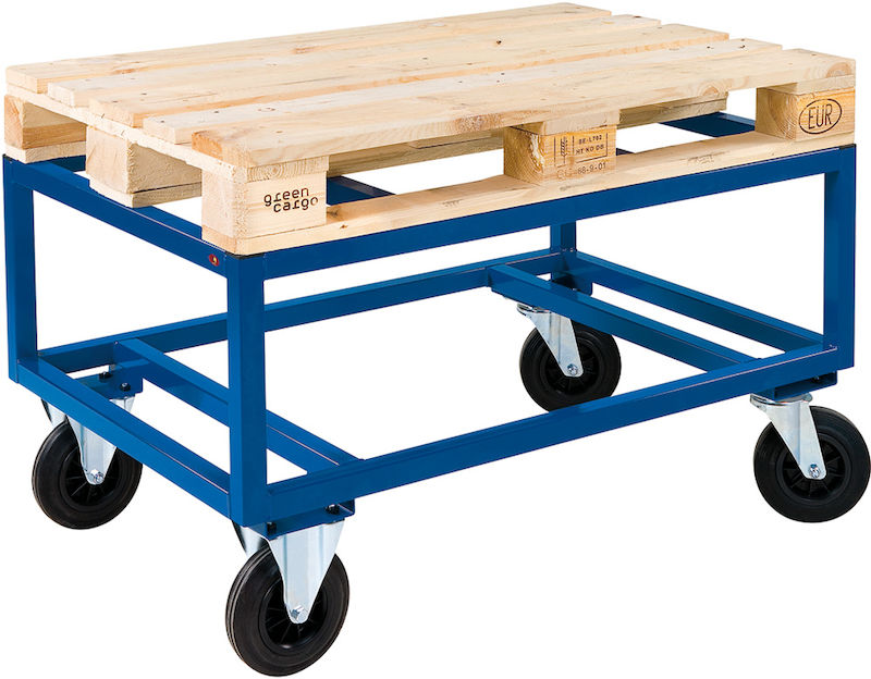 Kuormalavavaunu, punainen, puolilavalle, 800x600 mm. Elastisilla pyörillä 200 x 50 mm. 2 kpl kääntyviä pyöriä ja 2 kpl kiinteitä.
