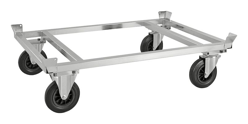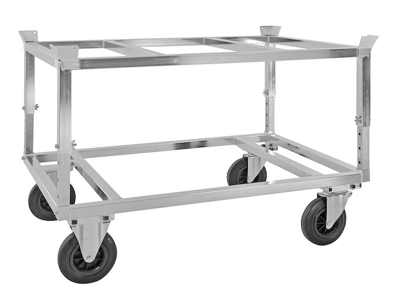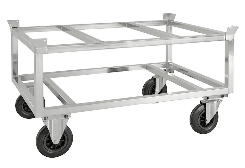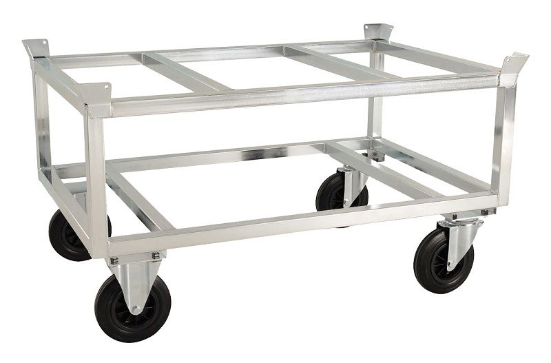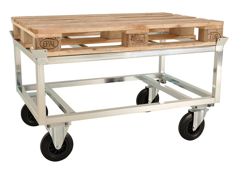 Kuormalavavaunu sopii EUR-lavoille PxL 1200x800 mm, korkeus 305 mm, hitsattu ja sähkösinkitty. Maks.kuormitus 800 kg. 2 kääntö ja 2 kiintopyörää. Umpikumipyörät 200x50 mm.
