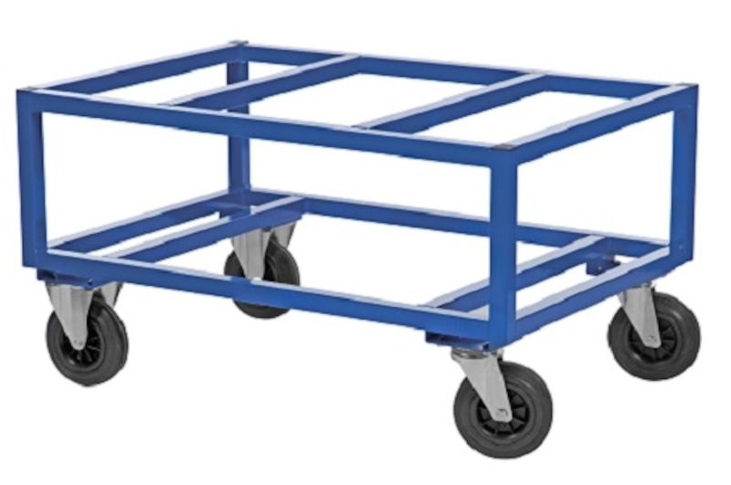 Kuormalavavaunu, sininen, FIN-lavalle, 1200x1000 mm, kumipyörillä 200 x 50 mm. 2 kpl kääntyviä pyöriä ja 2 kpl kiinteitä.