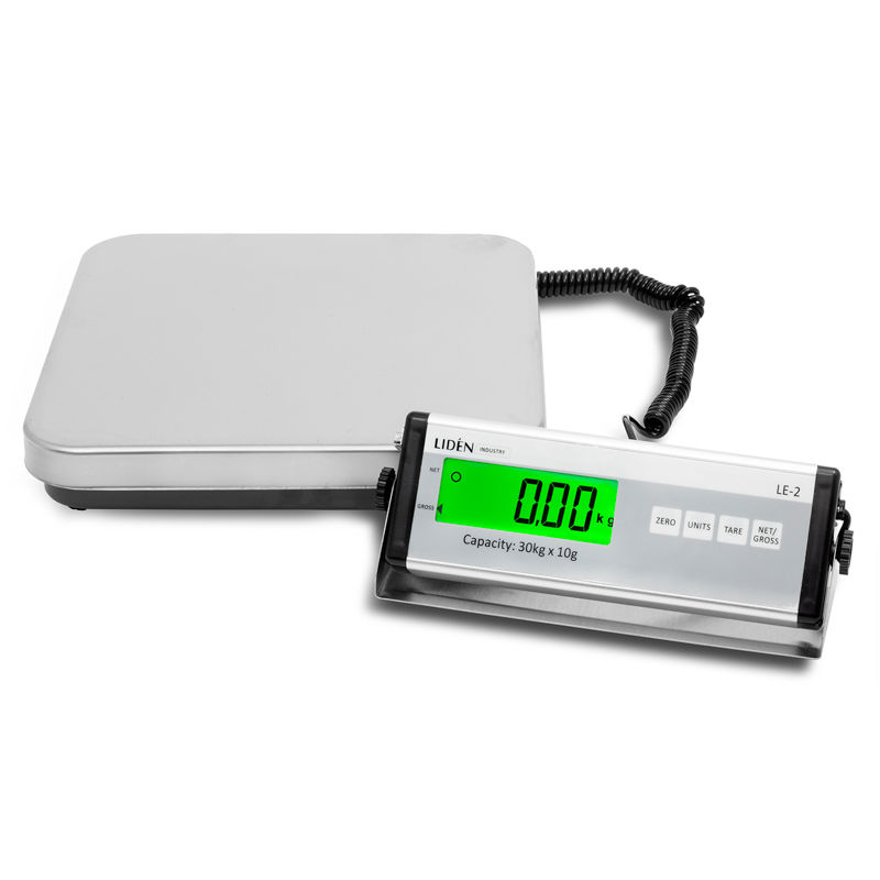 Pöytävaaka / Pakettivaaka LE2, punnitusalue 30 kg, tarkkuus 10 g. Punnitustaso ruostumatonta terästä. Taustavalaistu LCD-näyttö. RS-232 kaapeli vakiona. Ladattavat paristot sisältyvät.