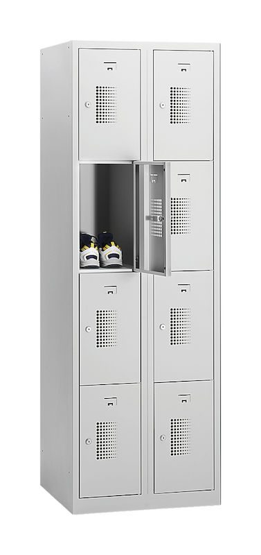 Lokerokaappi, 4 lokeroa Amsterdam, 2 osiota, vaaleanharmaa, L 600 mm, 8 lokeroa, sylinterilukko. Edullinen lokerokaappimme vakuuttaa toimivuudellaan, kestävyydellään ja monikäyttöisyydellään. Kaapin vaaleanharmaa runko on helppo puhdistaa. Jauhemaalatun teräksen materiaalipaksuus on 0,70 mm, ja sen ansiosta henkilökohtaiset arvoesineet voidaan säilyttää turvallisesti. Lokeroiden lukumäärä, lukitustyyppi, oven väri ja kaapin leveys voidaan valita tarpeiden ja käytettävissä olevan tilan mukaan. Metallikaapin ovien rei'itys takaa optimaalisen ilmanvaihdon.