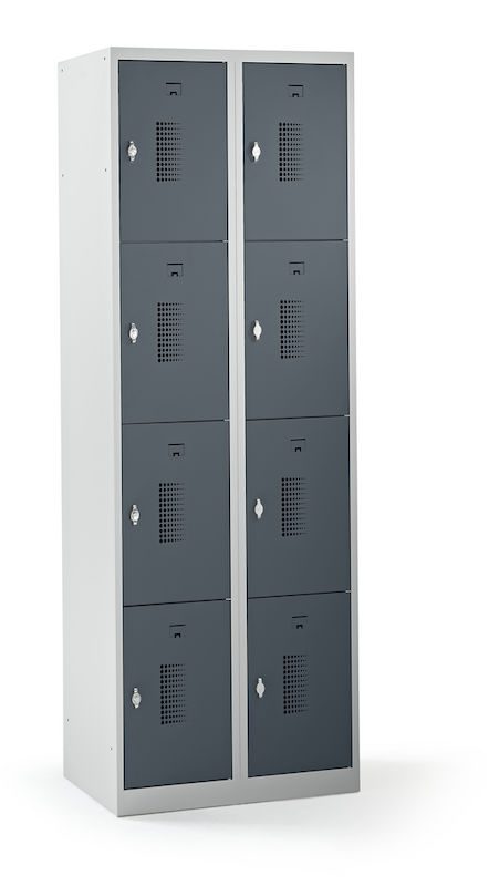 Lokerokaappi, 4 lokeroa Amsterdam, 2 osiota, vaaleanharmaa/basaltinharmaa, L 600 mm, 8 lokeroa, kääntösalpa. Edullinen lokerokaappimme vakuuttaa toimivuudellaan, kestävyydellään ja monikäyttöisyydellään. Kaapin vaaleanharmaa runko on helppo puhdistaa. Jauhemaalatun teräksen materiaalipaksuus on 0,70 mm, ja sen ansiosta henkilökohtaiset arvoesineet voidaan säilyttää turvallisesti. Lokeroiden lukumäärä, lukitustyyppi, oven väri ja kaapin leveys voidaan valita tarpeiden ja käytettävissä olevan tilan mukaan. Metallikaapin ovien rei'itys takaa optimaalisen ilmanvaihdon.