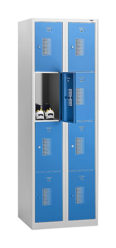 Lokerokaappi, 4 lokeroa Amsterdam, 2 osiota, vaaleanharmaa/vaaleansininen, L 800 mm, 8 lokeroa, sylinterilukko. Edullinen lokerokaappimme vakuuttaa toimivuudellaan, kestävyydellään ja monikäyttöisyydellään. Kaapin vaaleanharmaa runko on helppo puhdistaa. Jauhemaalatun teräksen materiaalipaksuus on 0,70 mm, ja sen ansiosta henkilökohtaiset arvoesineet voidaan säilyttää turvallisesti. Lokeroiden lukumäärä, lukitustyyppi, oven väri ja kaapin leveys voidaan valita tarpeiden ja käytettävissä olevan tilan mukaan. Metallikaapin ovien rei'itys takaa optimaalisen ilmanvaihdon.