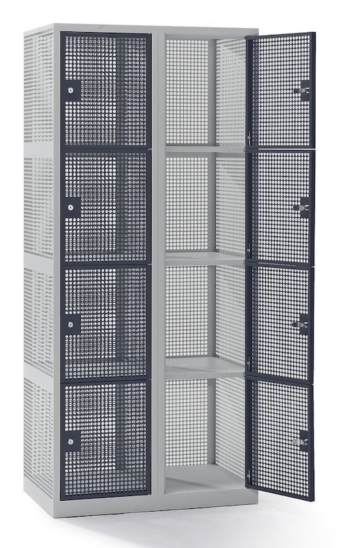 Lokerokaappi Klynne, LxSxK 800x500x1800mm, salpa, 8 ovea 2 kaapissa, harmaa/basaltinharmaa. Käytännöllinen pukukaappi rei’itetyllä ovella. Rei’itetyn oven läpi näkee kaappiin sisälle. Optimaalinen ilmanvaihto työvaatteille, urheiluvaatteille ja urheiluvarusteille. Toimitetaan asennettuna 60 mm sokkelilla. Saatavilla 2 lokeroiden leveyttä, 300 mm ja 400 mm.