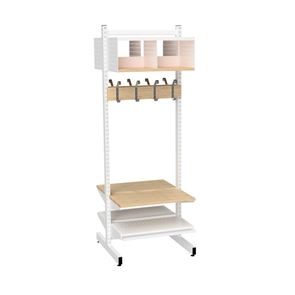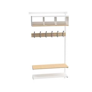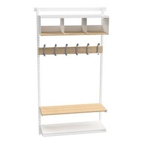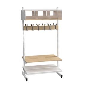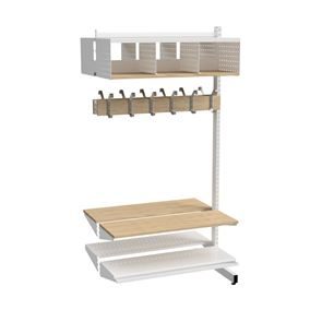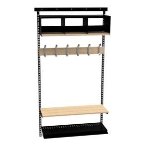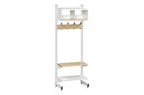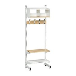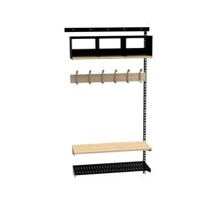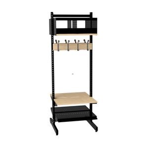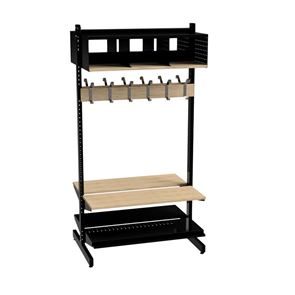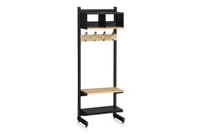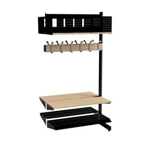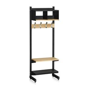 Vaateteline Savalen, kaksipuolinen, L900 mm, musta, malli C, jatko-osa. Käytännöllinen vaateteline erilaisilla lisävarustevaihtoehdoilla. Luo omanlaisesi ratkaisu perus- ja jatko-osilla. Lisävarusteet ovat siirrettävissä 25 mm välein. Lattiatelineessä on säädettävät jalat. Malli C: Kenkähylly tippa-astialla ja vaateteline rei’itettyä peltiä, istuinpenkki ja koukkulista koivua.