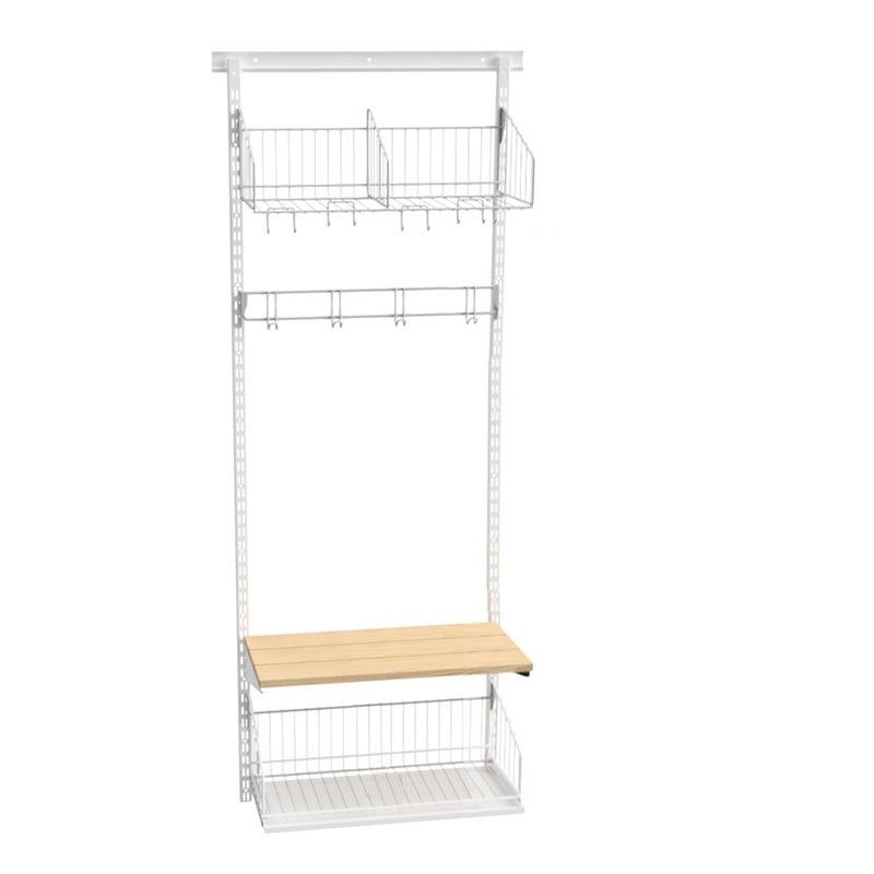 Vaateteline Savalen, seinämalli, L600 mm, valkoinen, malli A, perusosa. Käytännöllinen vaateteline erilaisilla lisävarustevaihtoehdoilla. Luo omanlaisesi ratkaisu perus- ja jatko-osilla. Lisävarusteet ovat siirrettävissä 25 mm välein. Lattiatelineessä on säädettävät jalat. Malli A: Kenkähylly tippa-astialla, istuinpenkki, koukkulista ja hattuhylly (lankahylly).