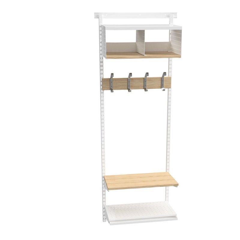 Vaateteline Savalen, seinämalli, L600 mm, valkoinen, malli C, perusosa. Käytännöllinen vaateteline erilaisilla lisävarustevaihtoehdoilla. Luo omanlaisesi ratkaisu perus- ja jatko-osilla. Lisävarusteet ovat siirrettävissä 25 mm välein. Lattiatelineessä on säädettävät jalat. Malli C: Kenkähylly tippa-astialla ja vaateteline rei’itettyä peltiä, istuinpenkki ja koukkulista koivua.