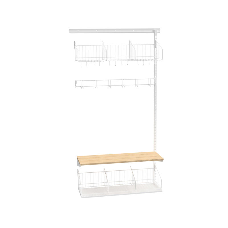 Vaateteline Savalen, seinämalli, L900 mm, valkoinen, malli A, jatko-osa. Käytännöllinen vaateteline erilaisilla lisävarustevaihtoehdoilla. Luo omanlaisesi ratkaisu perus- ja jatko-osilla. Lisävarusteet ovat siirrettävissä 25 mm välein. Lattiatelineessä on säädettävät jalat. Malli A: Kenkähylly tippa-astialla, istuinpenkki, koukkulista ja hattuhylly (lankahylly).