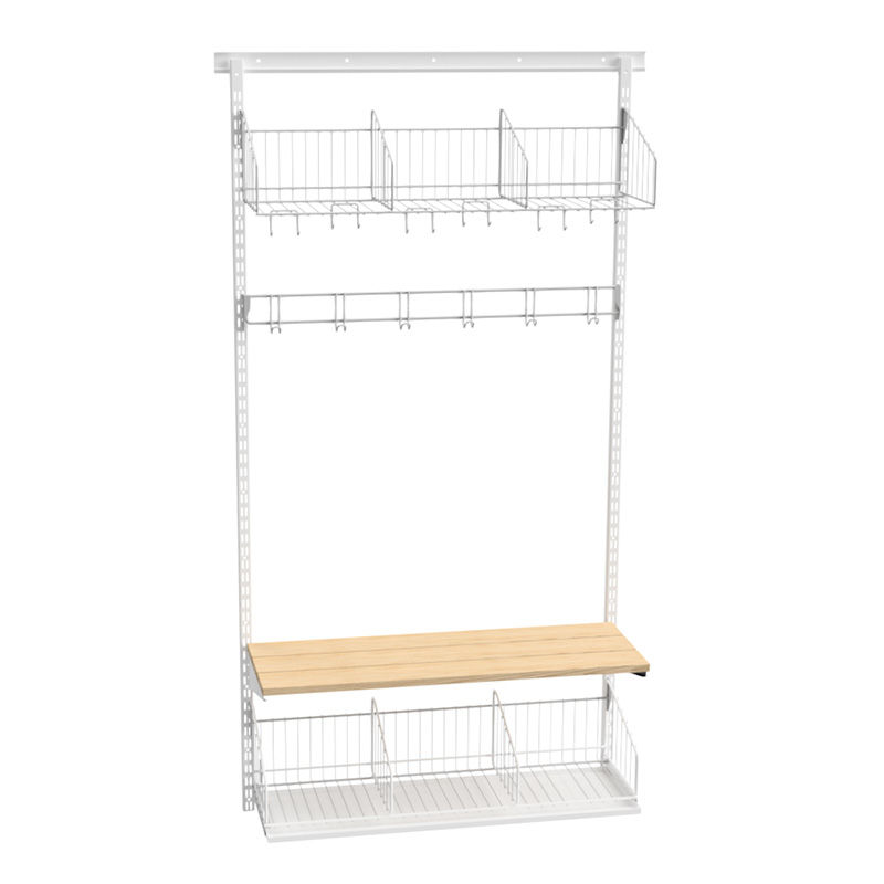 Vaateteline Savalen, seinämalli, L900 mm, valkoinen, malli A, perusosa. Käytännöllinen vaateteline erilaisilla lisävarustevaihtoehdoilla. Luo omanlaisesi ratkaisu perus- ja jatko-osilla. Lisävarusteet ovat siirrettävissä 25 mm välein. Lattiatelineessä on säädettävät jalat. Malli A: Kenkähylly tippa-astialla, istuinpenkki, koukkulista ja hattuhylly (lankahylly).