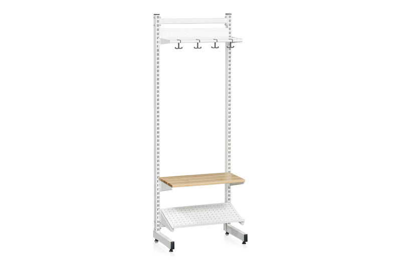 Vaateteline Savalen, yksipuolinen, L600 mm, valkoinen, malli D, jatko-osa. Käytännöllinen vaateteline erilaisilla lisävarustevaihtoehdoilla. Luo omanlaisesi ratkaisu perus- ja jatko-osilla. Lisävarusteet ovat siirrettävissä 25 mm välein. Lattiatelineessä on säädettävät jalat. Malli D: Kallistettava kenketeline ja vaatesäilytys rei’itettyä peltiä, istuinpenkki koivua.