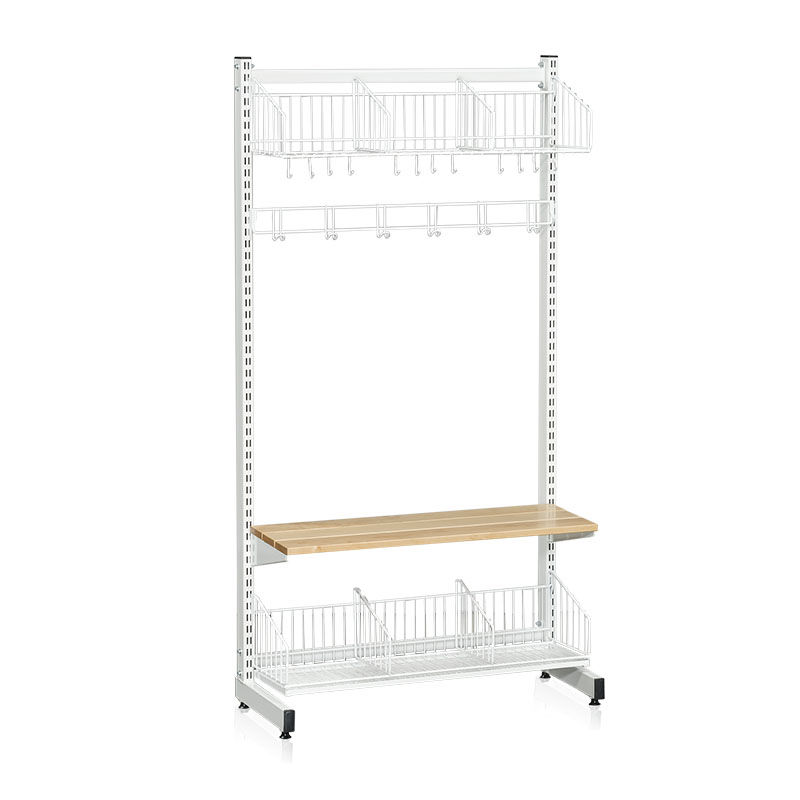 Vaateteline Savalen, yksipuolinen, L900 mm, valkoinen, malli A, perusosa. Käytännöllinen vaateteline erilaisilla lisävarustevaihtoehdoilla. Luo omanlaisesi ratkaisu perus- ja jatko-osilla. Lisävarusteet ovat siirrettävissä 25 mm välein. Lattiatelineessä on säädettävät jalat. Malli A: Kenkähylly tippa-astialla, istuinpenkki, koukkulista ja hattuhylly (lankahylly).