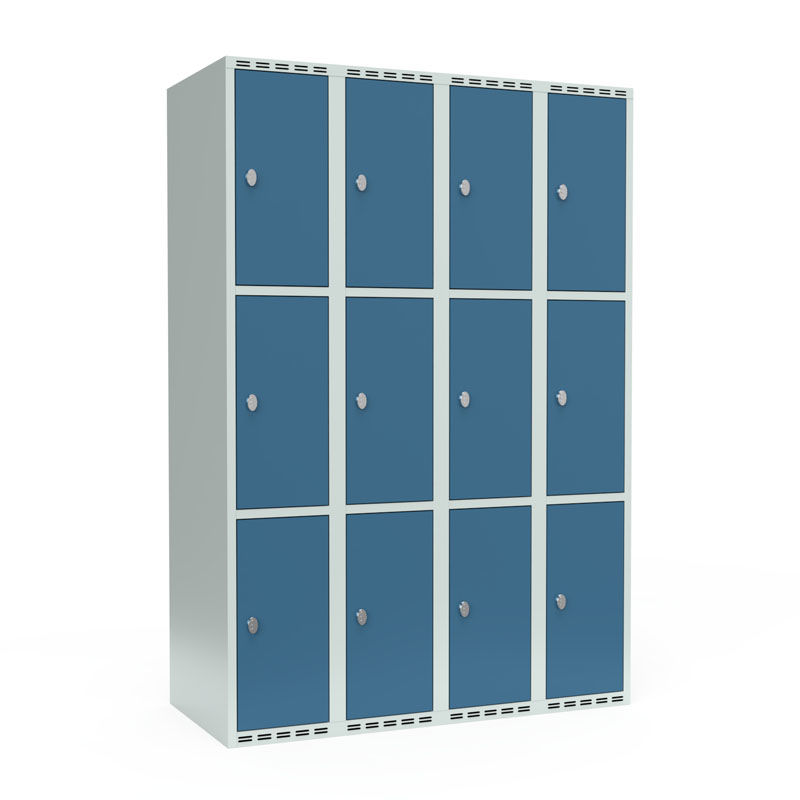 Lokerokaappi Fydor SMG, LxDxK 1200x550x1752 mm, 12 ovea 4 kaapissa, tasakatto, sininen/vaaleanharmaa. Fydor-sarjan pukukaapit ovat korkealaatuisia ja turvallisia täyshitsattuja kaappeja. Muotoiltu ja valmistettu käytännöllisyyttä ja turvallisuutta ajatellen.Fydor-kaapit ovat käyttäjäystävällisiä, peltisiä kaappeja, joiden lokerot sopivat useimpiin ympäristöihin. Täyshitsatut rungot sileällä pohjalla takaavat kaapin helpon puhdistettavuuden. Kaapin sivuilla on reiät ilmanvaihtoa varten, samoin oven ylä- ja alaosassa. Ovissa on tuplapelti-vahvikkeet, kumivaimentimet ja hitsattu ovistopperi, joka estää ovien paiskaantumisen toisiinsa. Kaapit kestävät kovaakin käyttöä ja ovat pitkäikäisiä. Fydor-sarjan kaapit toimitetaan valmiiksi kasattuina, valituilla lukoilla. Kaappi on helppo ottaa suoraan käyttöön!Vakiona haka omaa riippulukkoa varten. Lisätilauksesta saatavilla myös sylinterilukko tai koodilukkoRuotsalaisen Möbelfaktan ja Sundahusin laatu- ja ympäristöhyväksymä.>Testattu: EN 14073-2:2004, EN 14073-3:2004, EN 14074:2004, EN 16121:2013, EN 16122:2045.Fydor-kaapit ovat valittavissa useassa eri koossa, mallissa ja värissä, eri ovimäärillä, Z-ovilla, erilaisilla lukoilla, jalustoilla ja lisävarusteilla! Jos et löydä normaalista valikoimastamme sopivaa mallia, ota yhteyttä myyntiimme, niin katsomme sinulle erikoisratkaisun.