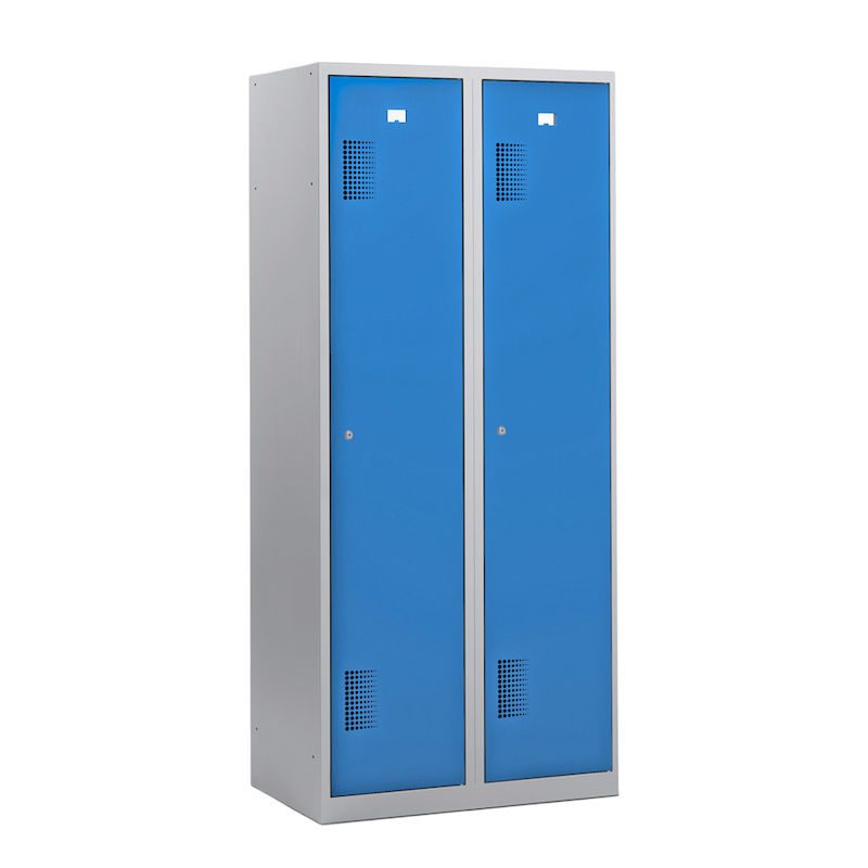Pukukaappi Amsterdam, 2 osiota, vaaleanharmaa/vaaleansininen, leveys 800 mm, sylinterilukko. Vaaleanharmaalla rungolla varustettu tukeva vaatekaappi on ihanteellinen säilytysratkaisu, joka takaa järjestyksen ja turvallisuuden.
