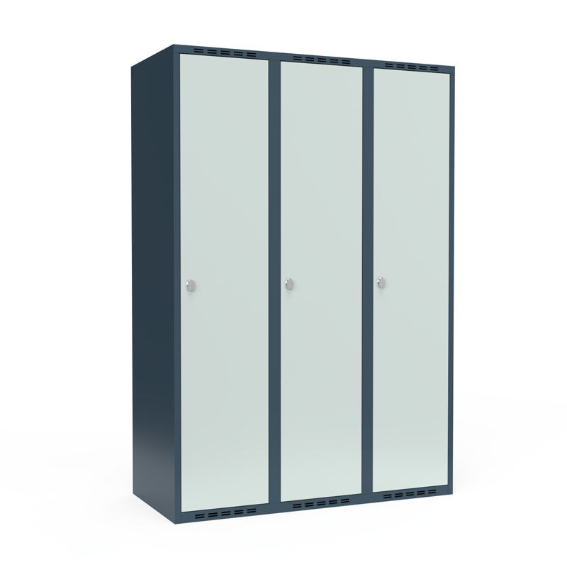 Pukukaappi Fydor SMG, LxSxK 1200 x550x1752 mm, 3 ovea 3 kaapissa, tasakatto, v.harmaa/harmaa. Fydor sarjan pukukaapit ovat korkealaatuisia ja turvallisia kokohitsattuja vaatekaappeja, jolla saat pukuhuoneet kalustettua toimivasti ja klassisesti. Saat pukuhuoneeseen modernin twistin, kun valitset pukukaapin haluamallasi värillä.