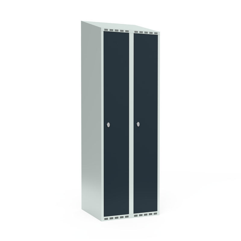 Pukukaappi Fydor SMG, LxSxK 600x 550x1900 mm, 2 ovea 2 kaapissa, vinokatto, ant/v.harmaa. Fydor sarjan pukukaapit ovat korkealaatuisia ja turvallisia kokohitsattuja vaatekaappeja, jolla saat pukuhuoneet kalustettua toimivasti ja klassisesti. Saat pukuhuoneeseen modernin twistin, kun valitset pukukaapin haluamallasi värillä.