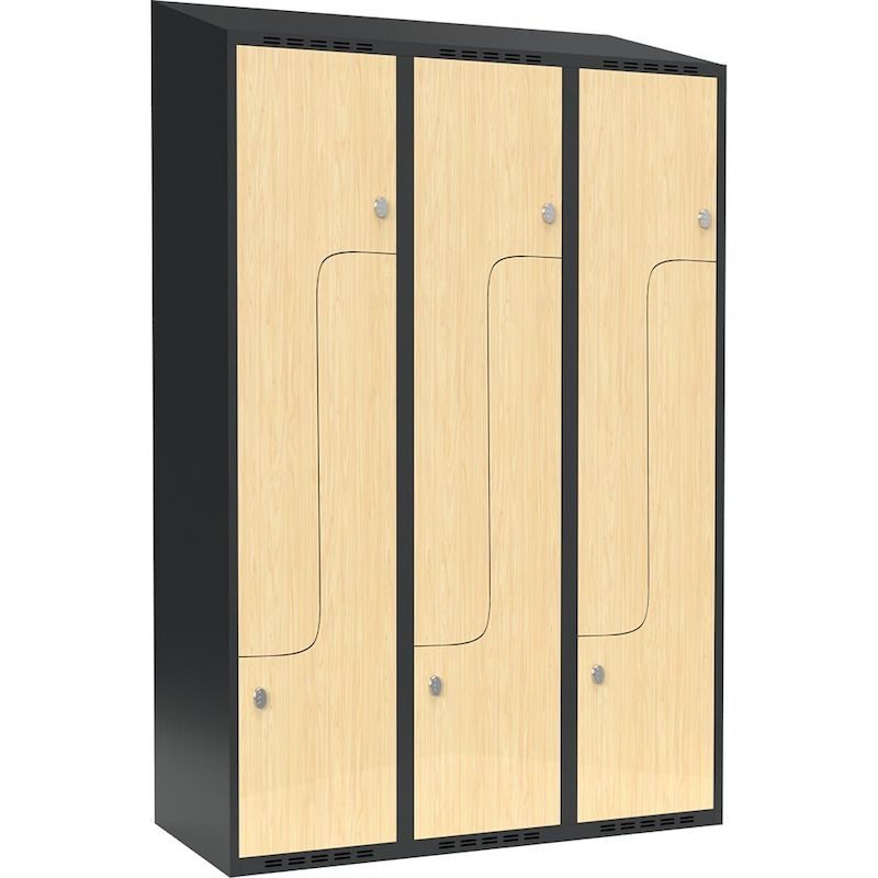 Z-kaappi Fydor SMZ, 1200x550x1900 mm, 6 ovea 3 kaapissa, vinokatto, ant/koivu. Fydor-sarjan pukukaapit ovat korkealaatuisia ja turvallisia kokohitsattuja vaatekaappeja, jolla saat pukuhuoneet kalustettua toimivasti ja klassisesti. Saat pukuhuoneeseen modernin twistin, kun valitset pukukaapin haluamallasi värillä.Pukukaappi Fydor on hinta-laatusuhteeltaan loistava. Valitse sinun pukuhuoneeseesi sopivat pukukaapit eri kokojen mukaan. Fydor pukukaapit on valmistettu ajatuksella ”käytännöllinen, toimiva ja kestävä”. Ne ovat käytännölliset ja suunniteltu sopimaan useimpiin eri ympäristöihin: niin toimiston pukuhuoneeseen tai sosiaalihuoneeseen, kuin myös varaston ja teollisuuden pukuhuoneisiin.Pukukaapin runko on täyshitsattu. Pohja on tasainen ja helppo siivota. Sivuilla reiät ilmanvaihtoa varten, samoin oven ylä- ja alaosassa. Vaatteet eivät mene tunkkaisiksi pukukaapissa, kun ilma vaihtuu reistä. Ovissa on tuplapelti-vahvikkeet, kumivaimentimet ja hitsattu ovistopperi, joka estää ovien paiskomisen toisiinsa.Fydor-sarjan pukukaapit toimitetaan valmiiksi kasattuna, valituilla lukoilla. Pukukaappi on helppo suoraan käyttöön! Vakiona haka omaa riippulukko varten. Lisätilauksesta saatavilla myös sylinterilukko tai koodilukko. Voit valita pukukaappiin erilaiset jalustat, nämä toimitetaan erikseen. Asennus jalustaan on helppo, kaappi nostetaan jalustan päälle ja kiinnitetään ruuveilla.Tilan ollessa rajattu ovat Z-kaapit luonteva ratkaisu. Z-kaapit ovat tarpeeksi korkeita takkien ja muiden vaatteiden ripustamiseen ja samanaikaisesti niissä on tarpeeksi tilaa esimerkiksi kengille ja laukuille tai vastaavalle tavaralle.Tasakatto on loistava valinta, jos haluat hyödyntää vielä kaapin kattoa säilytyksessä. Toisena vaihtoehtona on vinokatto. Vinokatolla voi esimerkiksi estää tavaroiden säilytyksen pukukaapin päällä.Fydor pukukaappien sisällä on vahva vaatetanko ja tupla-ankkurit/-koukut jokaisen oven takana.Testattu: EN 14073-2:2004, EN 14073-3:2004, EN 14074:2004, EN 16121:2013, EN 16122:2045.Fydor pukukaapit ovat valittavissa useassa eri koossa, mallissa ja värissä eri ovimäärillä, Z-ovilla, erilaisilla lukoilla, jalustoilla ja lisävarusteilla! Jos et löydä normaalista valikoimastamme sopivaa pukukaappia, ota yhteyttä myyntiimme, niin katsomme sinulle erikoisratkaisun.
